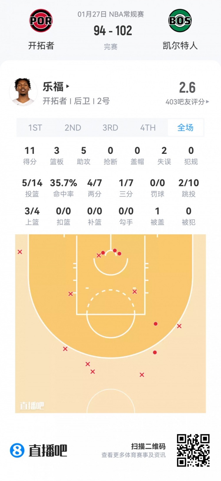 开元体育-【菜鸟】杨瀚森DNP 克尼佩尔12分8板6助2断 乐福14投11分三分7中1